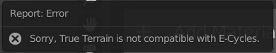Unfortunately, we do not, and simply cannot, support terrain creation with TrueTERRAIN, while inside of an E-Cycles build of Blender. E-Cycles changes too many functions inside of Blender, for us to create a compatible addon for this and have we have been plagued with consistent issues from not being able to add materials, not being able to append assets and not being able to update scatter systems for the users.