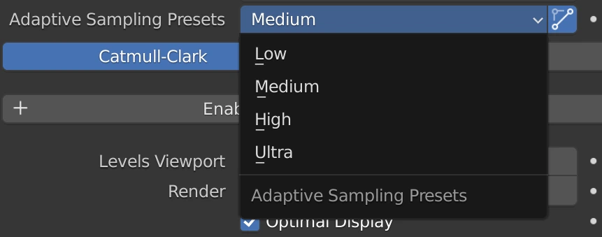 Adaptive Sampling Presets: Choosing a preset will change the scene's Adaptive Subdivision settings and the scene's Simplify settings if Change Simplify is on.