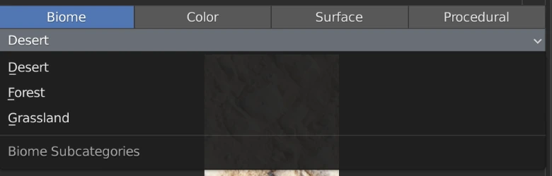 A secondary category menu will be given directly below the main categories (“Desert” is selected currently in the example image above).