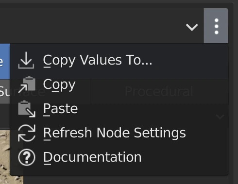 - Copy the active node settings to a copy buffer. Go to another node on this material or another of the same type to paste the settings.