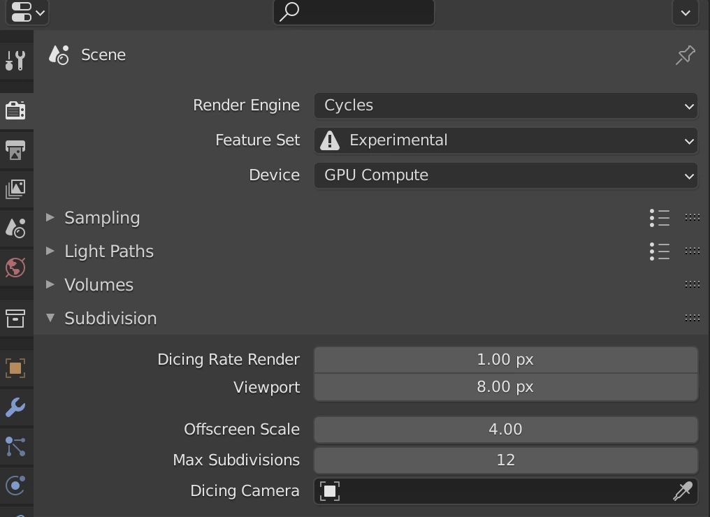By default, Blender sets your Dicing rate to 1.00 px for rendering, and Max Subdivisions to 12.